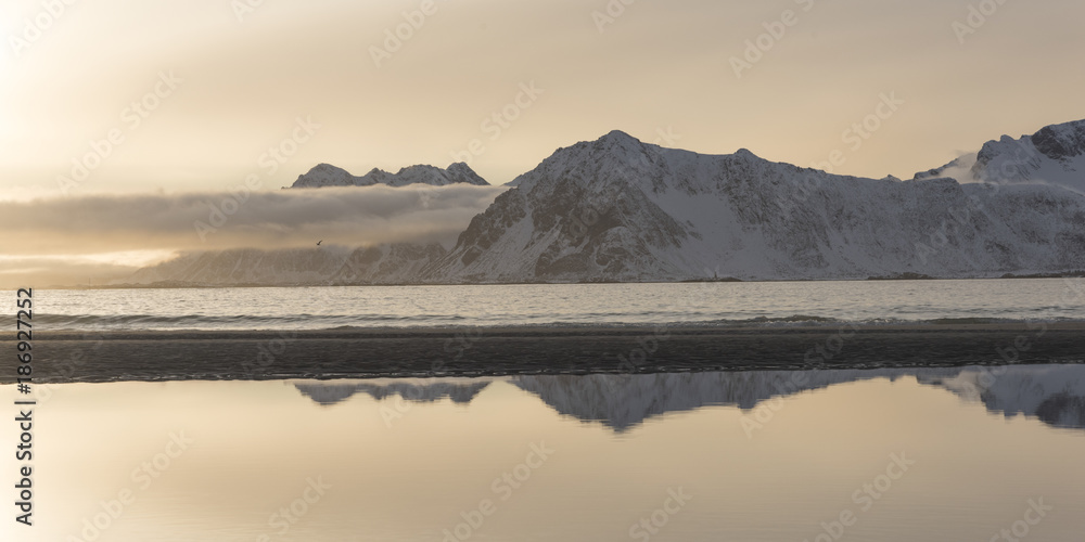 Reflection of mountain in water, Saltdal Fjord, Norway