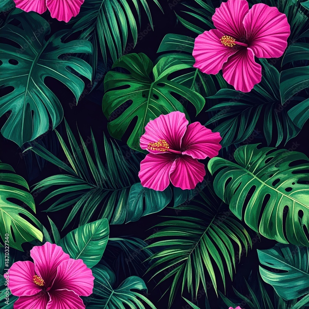 Dark Tropical Pattern With Pink Hibiscus Flowers And Wallpaper Mural - Decorly Solutions | Decorly Solutions