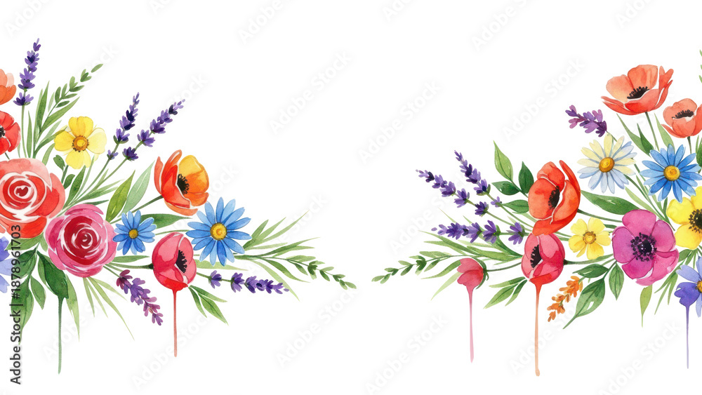 Watercolor Illustration Of Colorful Flowers In Wide Border Wallpaper Mural - Decorly Solutions | Decorly Solutions