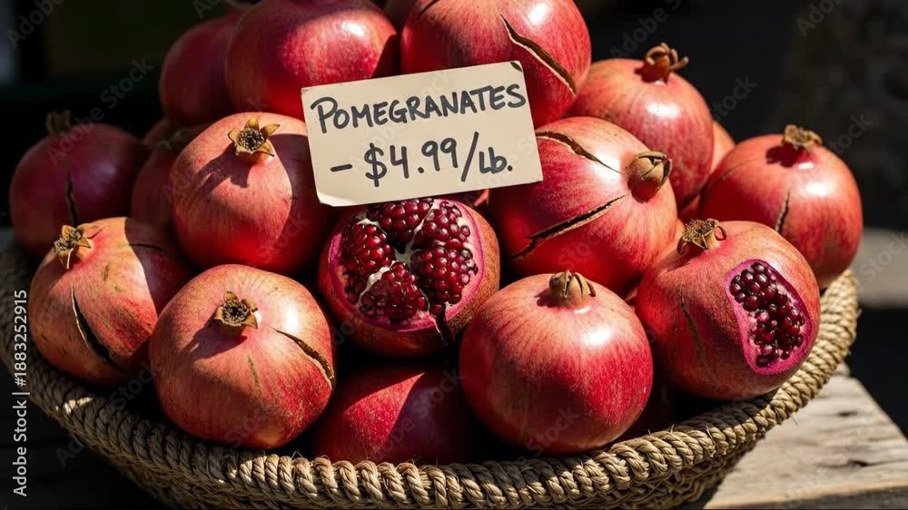 Fresh pomegranates arrangement with price tag in sunlit mark Wallpaper