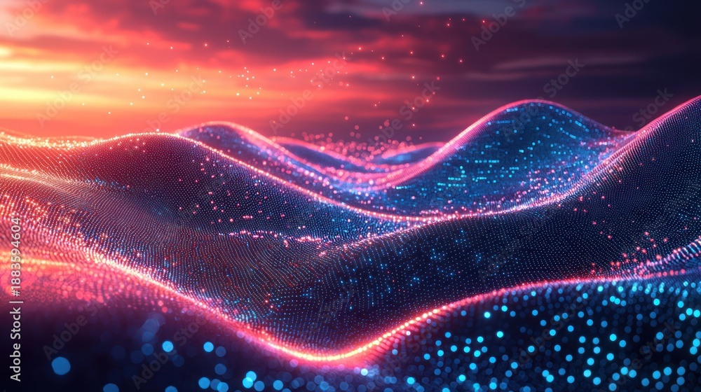 Sunset Over Glowing Particle Hills Abstract Digital Landscape Wallpaper Mural - Decorly Solutions | Decorly Solutions
