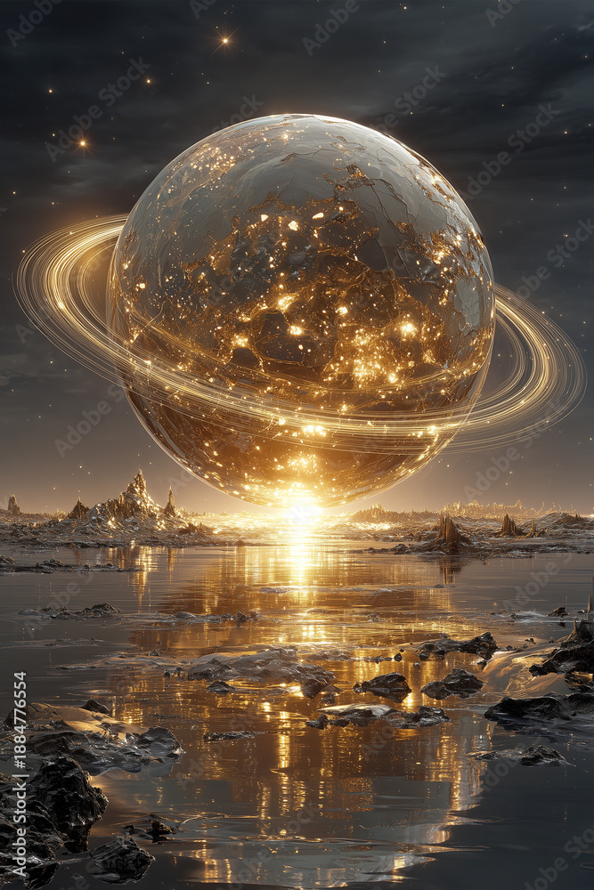 Giant Golden Ringed Planet Over Alien Ocean Wallpaper Mural - Decorly Solutions | Decorly Solutions