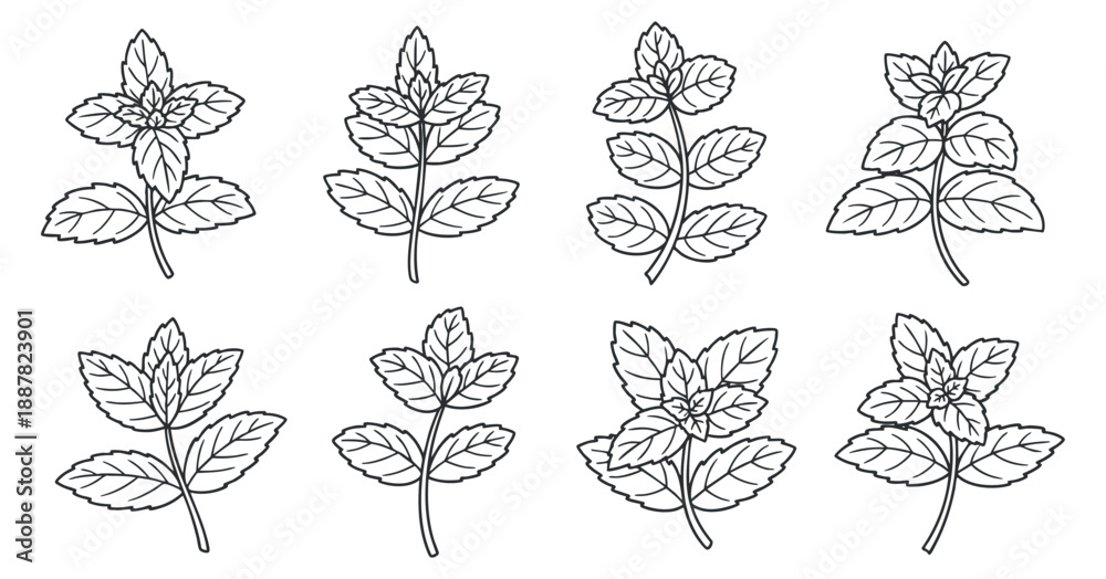 A Collection Of Mint Leaves In Detailed Outline Wallpaper Mural - Decorly Solutions | Decorly Solutions
