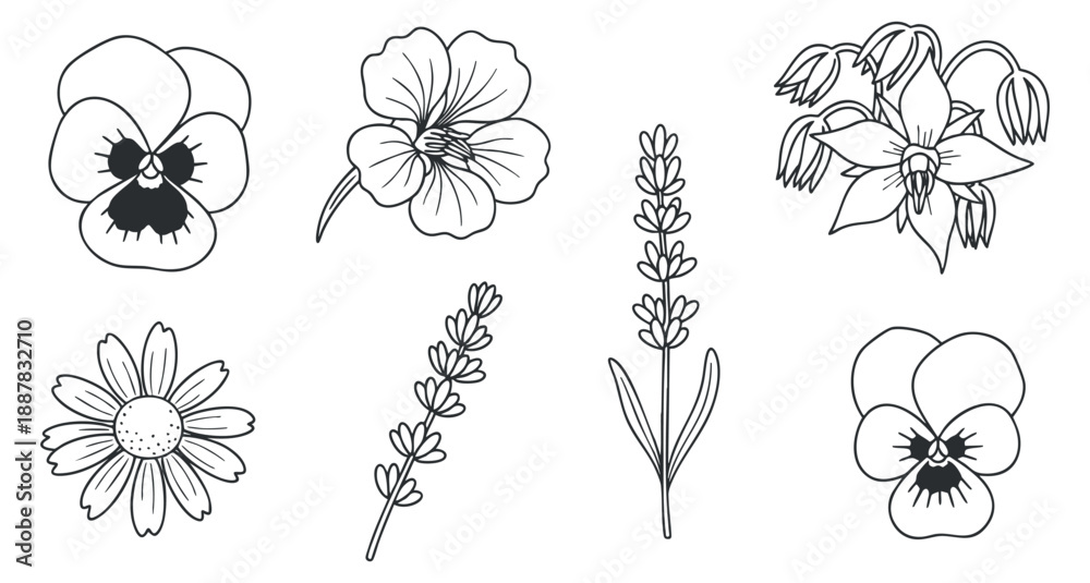 Floral Serenity: A Collection Of Intricate Line Drawings Of Various Flowers And Botanical Elements, Bringing A Sense Of Delicate Artistry And Natural Beauty