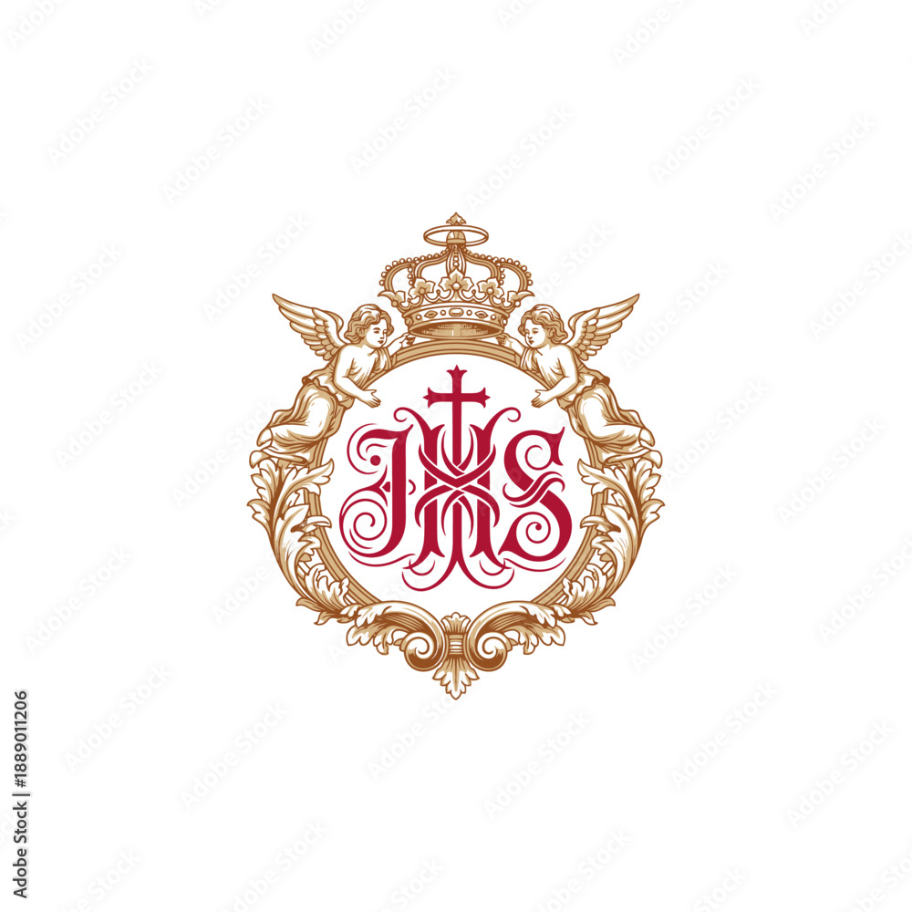 Ihs Monogram With Angels And Ornate Filigree Design.