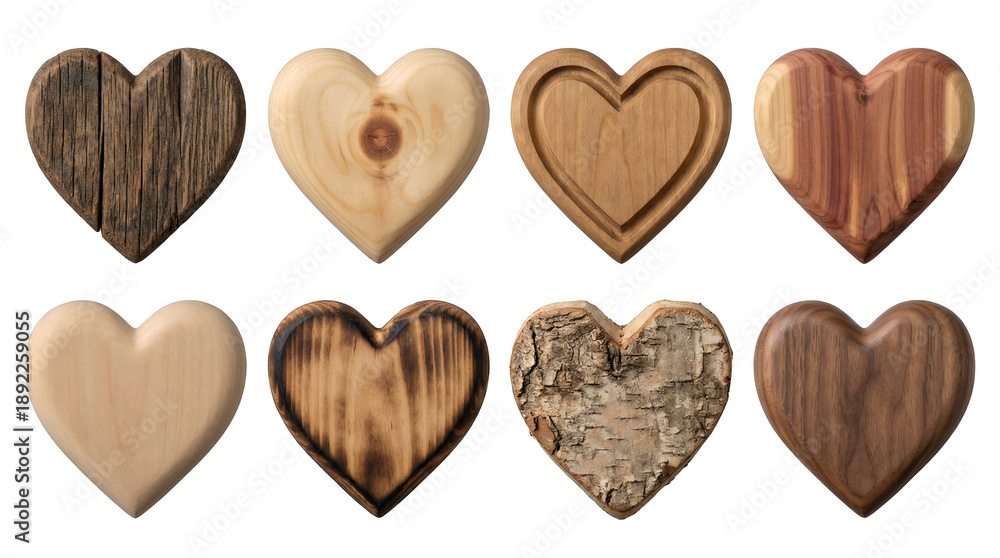 Wooden heart set including carved, rustic, weathered, polished, and grain textured varieties isolated. Decorative craft and romantic symbol collection.