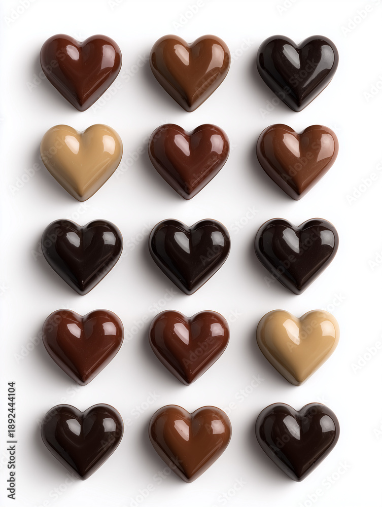 valentine's day chocolate assortment with heart shapes on pink background, top down view of gourmet heart chocolates collection, elegant sweet treats for romance