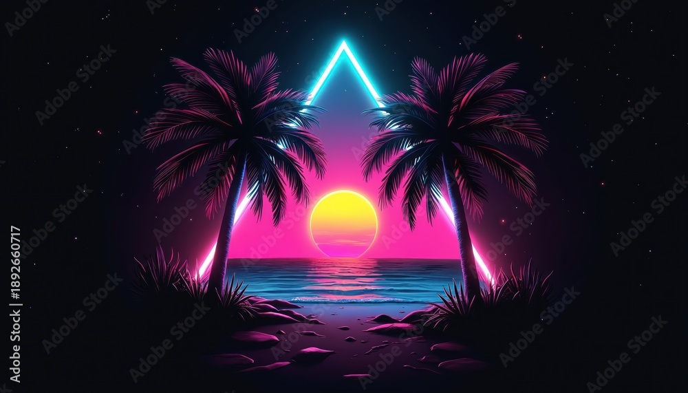 Retro Vaporwave Sunset Horizon with Pixelated Palm Trees on a Tropical Island Synthwave Aesthetics and Vibrant Glowing Neon Colors