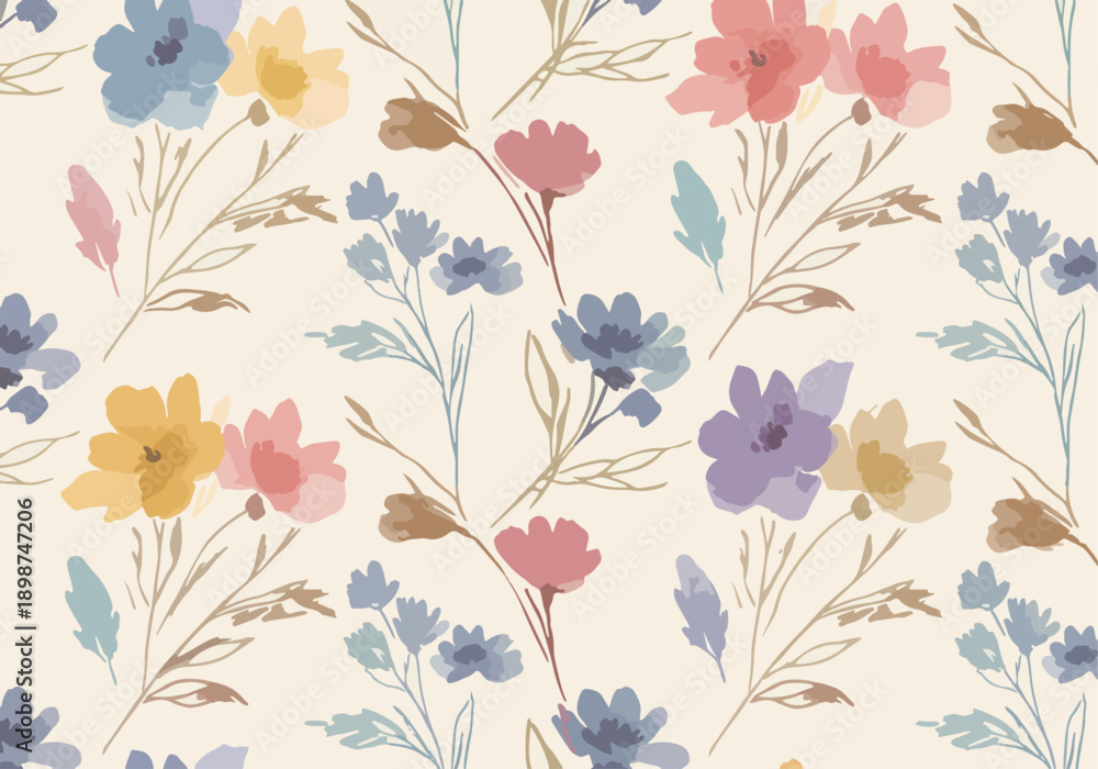 Gentle floral meadow pattern with delicate flowers and soft natural colors