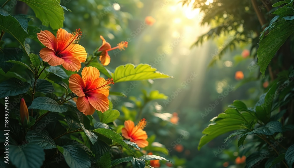 Bright Orange Hibiscus Flowers Grow In Rich Green Wallpaper Mural - Decorly Solutions | Decorly Solutions