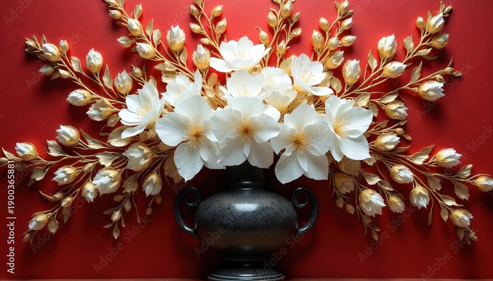 Dark Vase Holds White And Gold Floral Arrangement Wallpaper Mural - Decorly Solutions | Decorly Solutions