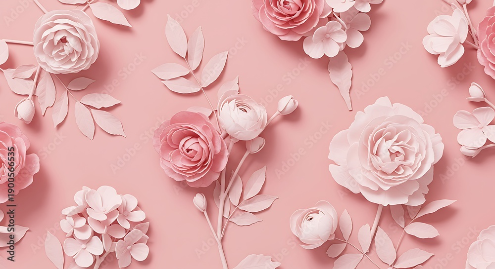 Pink floral background with paper flowers and leaves on a pink pastel colored surface in a flat lay top view. Concept for a wedding invitation card, Valentine's day greeting banner