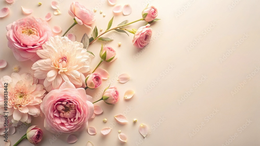 Elegant Floral Arrangement Flat Lay with Copy Space -  Pink Roses and Green Leaves