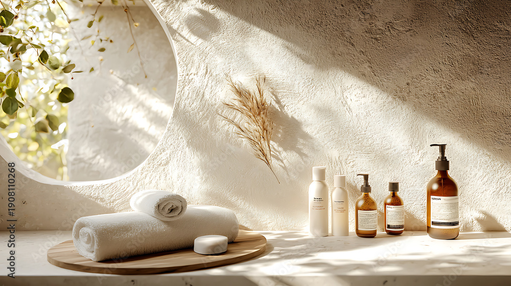 Elegant still life of natural skincare products with sunlight and shadows creating a calming and spalike atmosphere