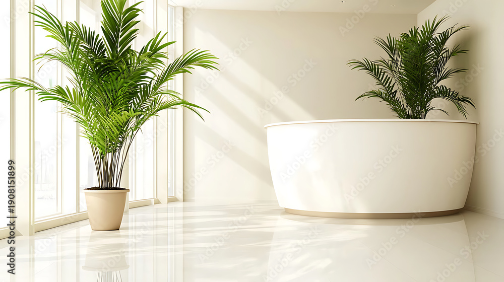 Bright sunlight filters through large windows modern office space, highlighting lush green plant foreground. atmosphere feels vibrant and inviting