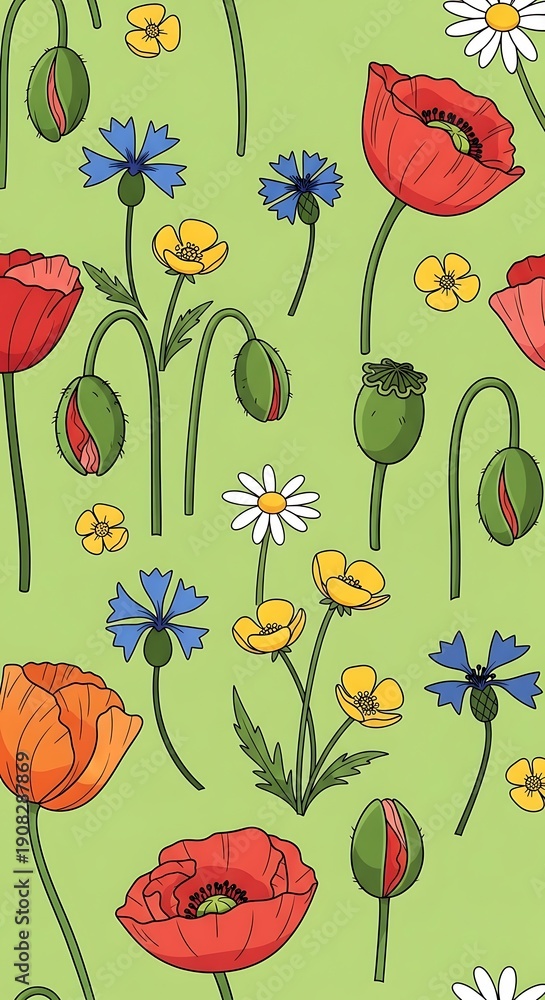 Whimsical Wildflower Pattern Hand-drawn Botanic Illustration On Green Wallpaper Mural - Decorly Solutions | Decorly Solutions