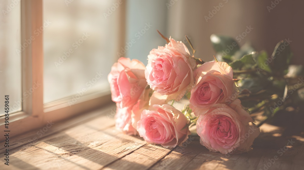 Realistic pink rose bouquet resting on rustic table with warm natural light and soft petal textures