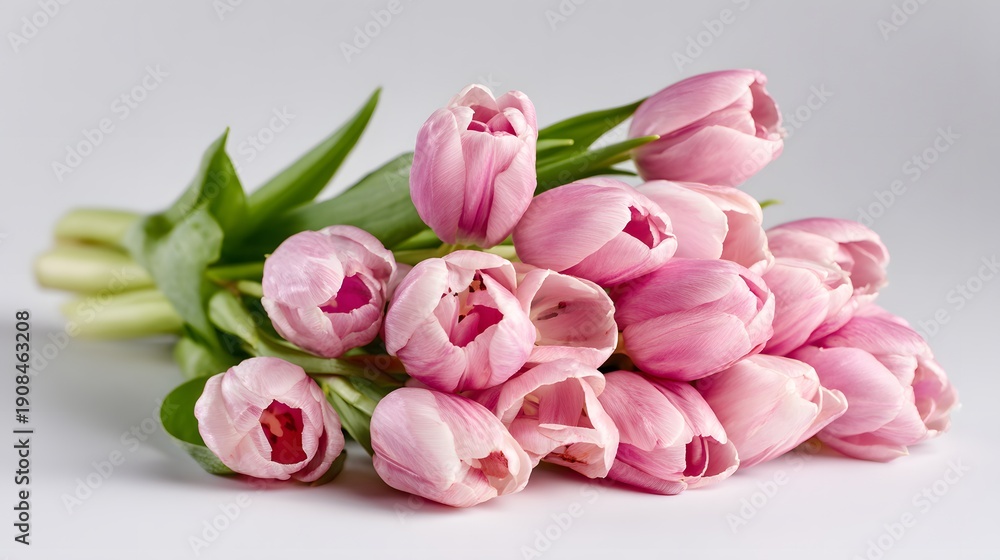 A Big Bouquet Of Beautiful Pink Tulips Lies On A White Background .