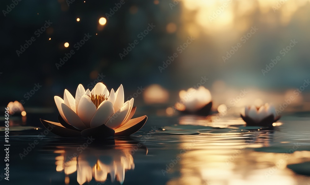 Serene water lily at sunset lake peaceful nature memorial scene spiritual reflection moment tranquil beauty contemplative atmosphere soft golden lighting calm water