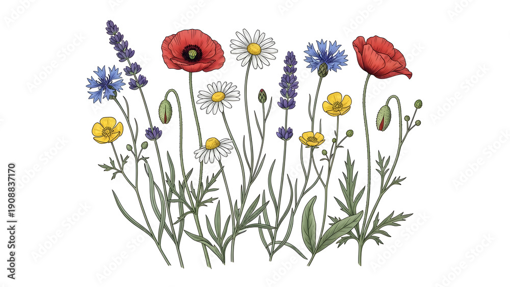 Wildflowers Collection in Watercolor Style with Vibrant Colors on White Background for Floral Design