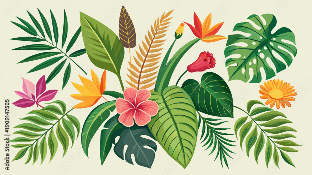 Collection of realistic tropical leaves and vibrant exotic flowers, perfect for creating lush summer or nature-themed designs.