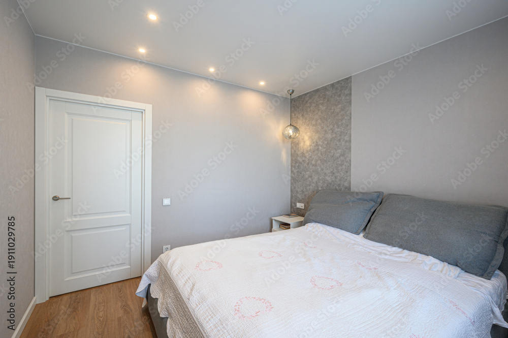 A minimalist bedroom with a double bed grey pillows white qu Wallpaper