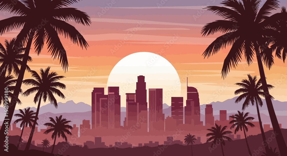 Los Angeles Skyline At Sunset With Palm Trees Wallpaper Mural - Decorly Solutions | Decorly Solutions