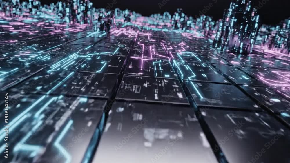 Futuristic digital circuit board with neon lights and cityscape in the background