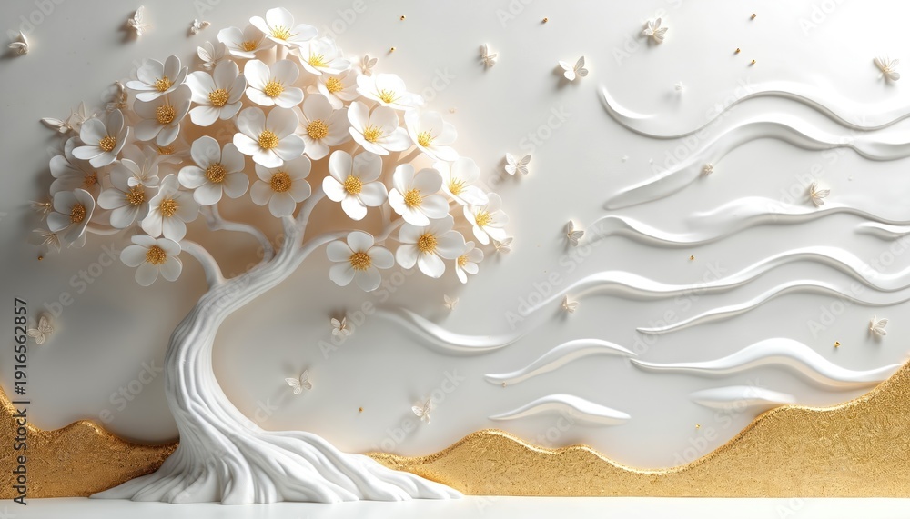 Three-dimensional White Blossom Tree Relief With Gold Accents Wallpaper Mural - Decorly Solutions | Decorly Solutions