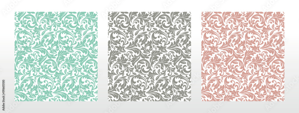 Wallpapers in the style of Baroque. Seamless vector backgrounds. Set of colored floral ornaments. Graphic patterns for fabric, wallpaper, packaging. Ornate Damask flower ornaments