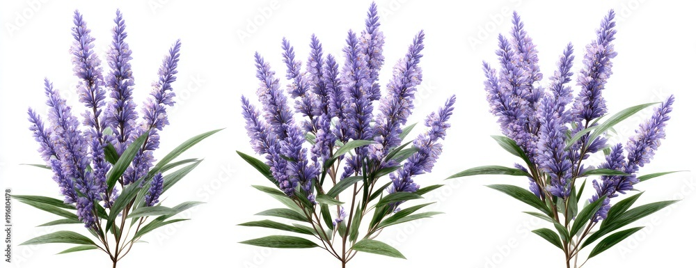 Three Clusters Of Vibrant Purple Lavender Flowers With Green Stems Arranged On A White Background, Showcasing Natural Beauty And Freshness