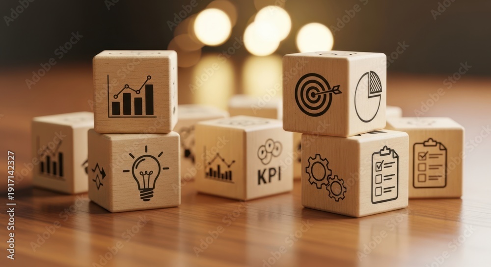 Wooden blocks stacked with business strategy icons.