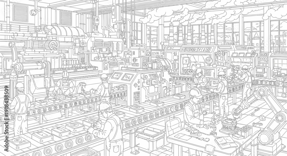 Detailed Monochrome Line Art Illustration Of A Bustling Wallpaper Mural - Decorly Solutions | Decorly Solutions