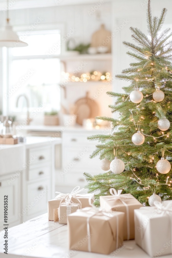 Festive Kitchen With Decorated Christmas Tree And Wrapped Wallpaper Mural - Decorly Solutions | Decorly Solutions