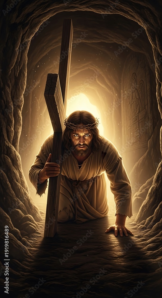 Spiritual Figure Carrying A Wooden Beam Through A Wallpaper Mural - Decorly Solutions | Decorly Solutions