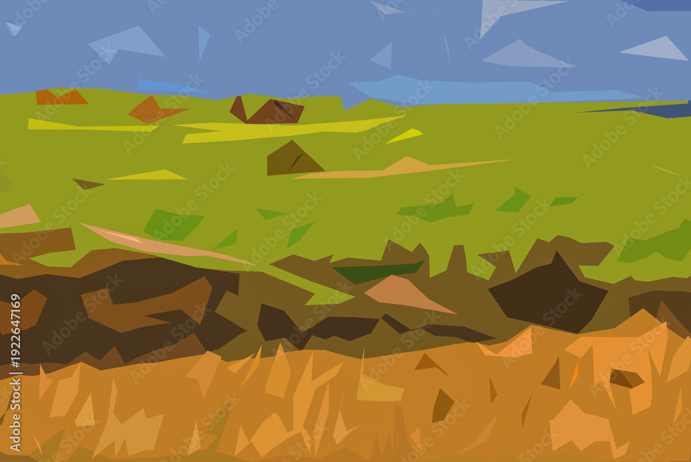Watercolor Landscape Hills, Tree, Flowery Bush Illustration