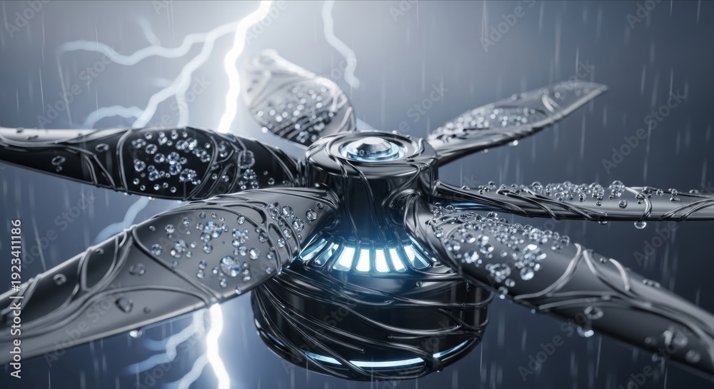 Futuristic Fan Design with Water Droplets and Lightning Back Wallpaper