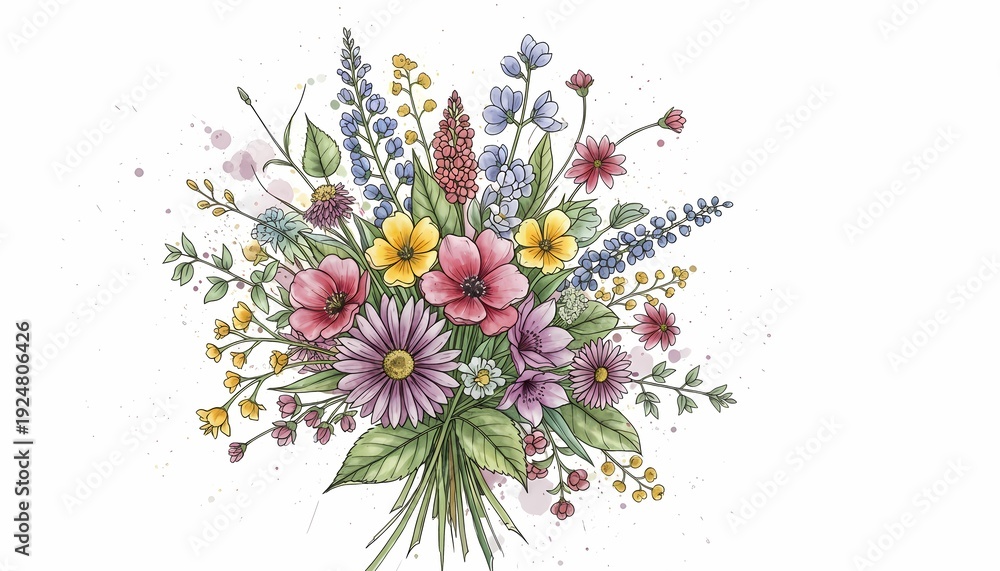 Hand Drawn Wildflower Bouquet with Pastel Spring Flowers