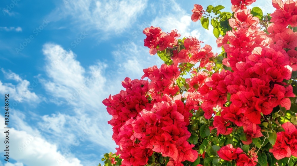 Vibrant Red Bougainvillea Flowers Against A Blue Sky Wallpaper Mural - Decorly Solutions | Decorly Solutions