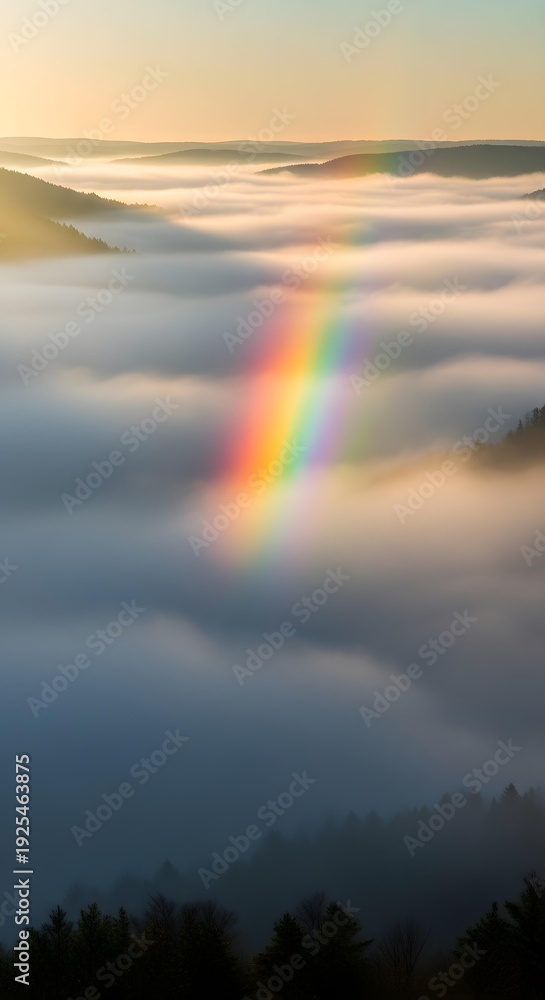 Vibrant Double Rainbow Over Misty Mountain Valley at Sunrise Wallpaper