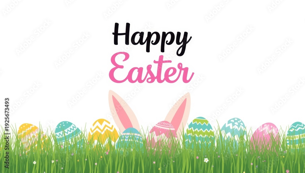 Happy Easter Bunny Ears and Colorful Decorated Eggs in Green Grass