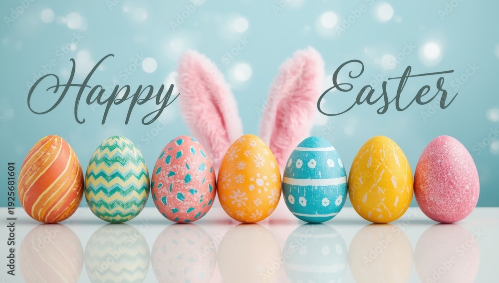 Colorful Easter Eggs With Bunny Ears On Blue Wallpaper Mural - Decorly Solutions | Decorly Solutions