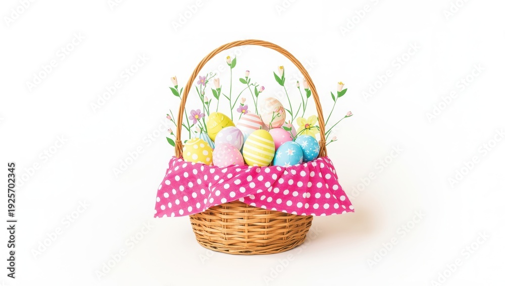 Colorful easter eggs in a traditional wicker basket on white background symbolizing springtime and holiday celebrations