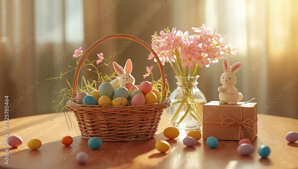 Easter basket with colorful eggs and bunnies on a table with flowers