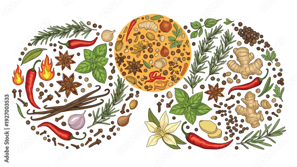Spicy ingredients like chili peppers and ginger roots are arranged in a circular wreath pattern with fire icons to denote heat.