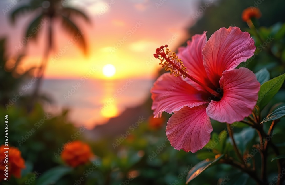 Pink Hibiscus Flower On Tropical Beach At Sunset Wallpaper Mural - Decorly Solutions | Decorly Solutions