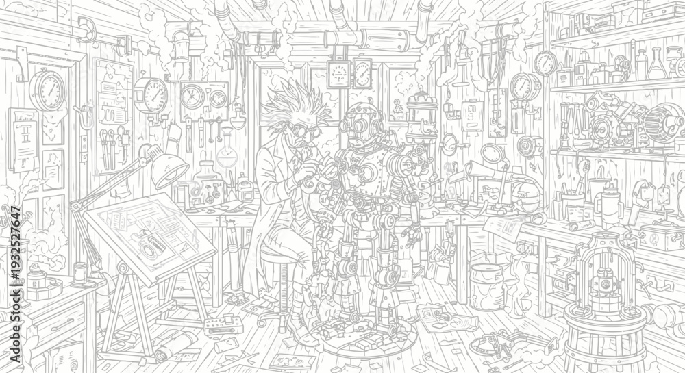 Detailed line drawing of a cluttered room Wallpaper