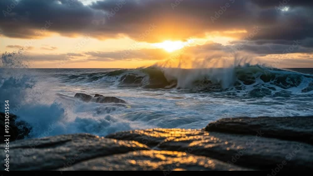 Dramatic Ocean Waves Crashing Against Rocks At Sunset Wallpaper Mural - Decorly Solutions | Decorly Solutions