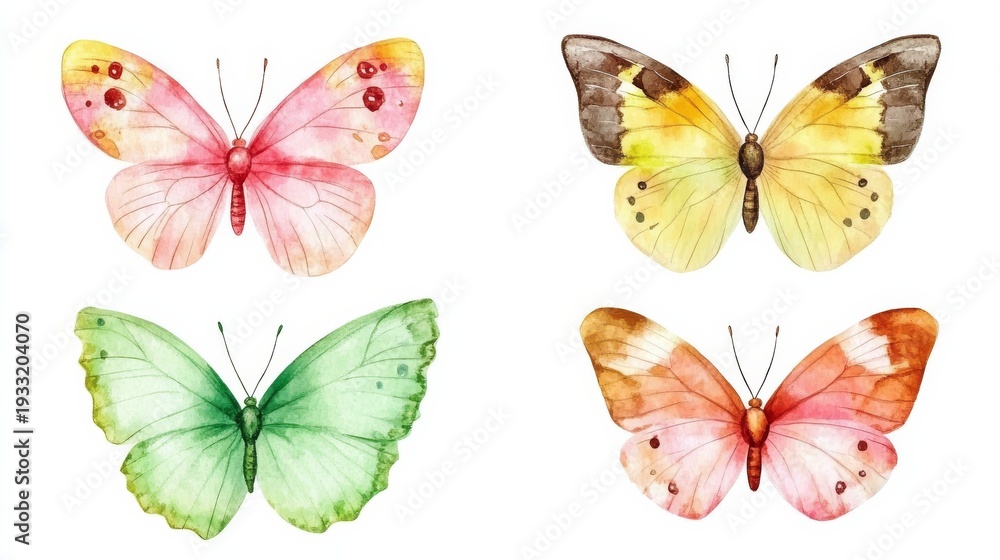 Colorful butterflies in watercolor showcasing pink, green, and yellow designs on a bright white background