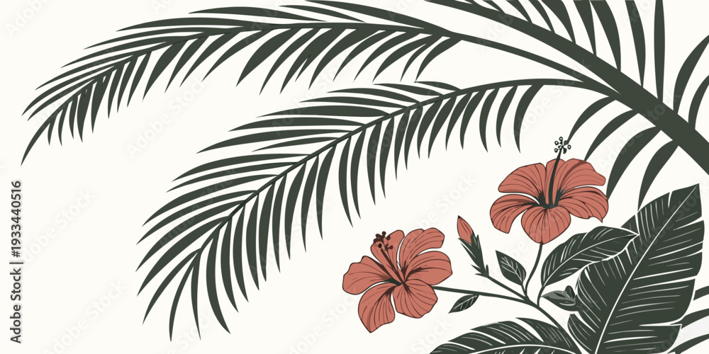 Tropical Hibiscus Flowers And Palm Leaves Vector Wallpaper Mural - Decorly Solutions | Decorly Solutions